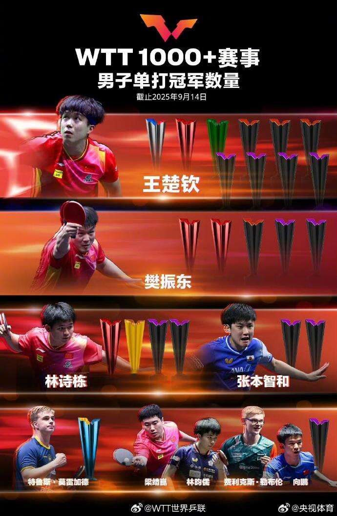 男单方面,王楚钦以10座奖杯荣登榜首!