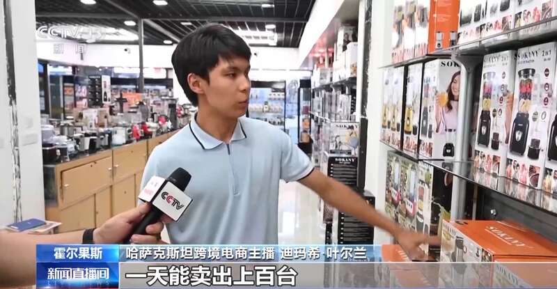 哈萨克斯坦跨境电商主播 迪玛希·叶尔兰:我们国家的人喜欢喝果汁,像这样的榨汁机特别受欢迎,一天能卖出上百台。