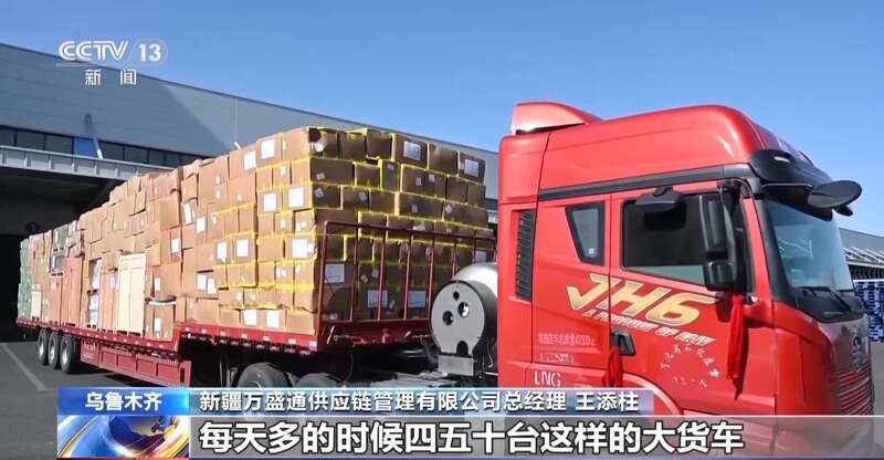 新疆万盛通供应链管理有限公司总经理王添柱:以前谁在新疆发空运,现在全国各地的大货车都到新疆来发,每天多的时候四五十台的大货车就在这排队进去。