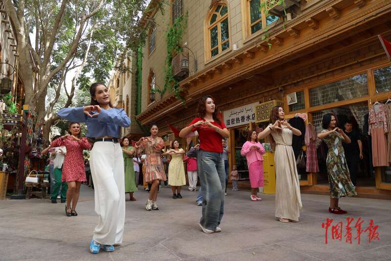9月12日,新疆和田团城,当地居民、商铺店主在街区内跳舞迎客。中青报·中青网记者 王鑫昕/摄