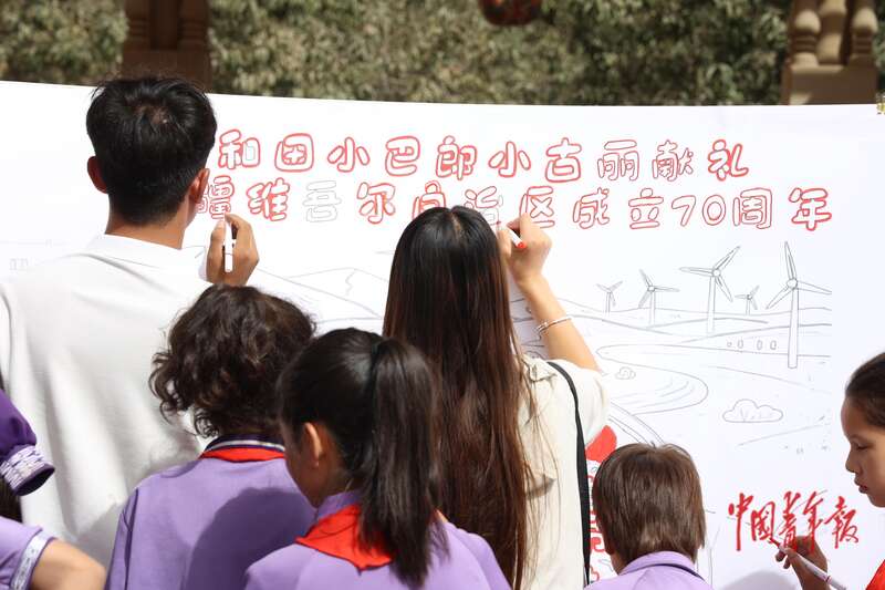 9月12日,新疆和田团城,参加研学活动的小学生们在和田团城描绘一幅巨型画作,迎接自治区成立70周年。中青报·中青网记者 王鑫昕/摄