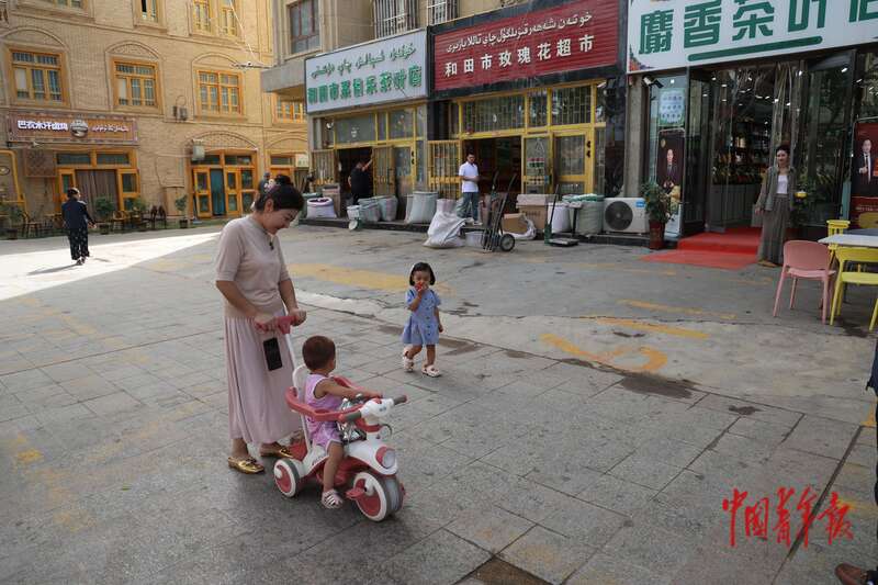 9月12日,新疆和田团城,一家商户的门口。团城改造后,临街居民有的自己开店,有的把一楼出租开店,楼上用来住宿。随着游客的增加,当地居民的收入也增加了。中青报·中青网记者 王鑫昕/摄