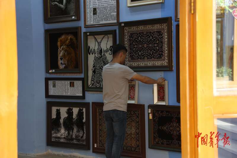 9月12日,新疆和田团城,当地手工羊毛地毯行业协会的一个展厅内,工作人员在整理羊毛地毯展品。和田地毯被称为“和田老三宝”之一,借助团城旅游的发展,当地手工羊毛地毯受到了越来越多游客的青睐。中青报·中青网记者 王鑫昕/摄