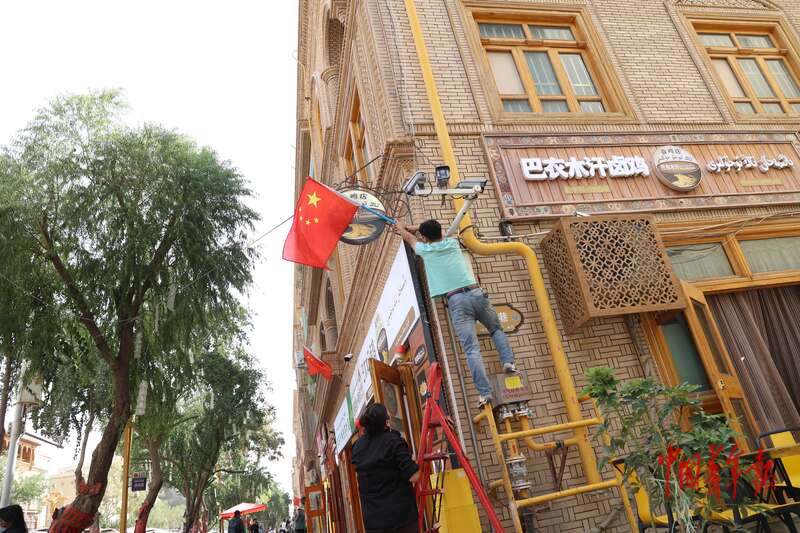 9月12日,新疆和田团城,一家餐饮店的店主在悬挂国旗迎接国庆节,也迎接即将到来的客流高峰。中青报·中青网记者 王鑫昕/摄
