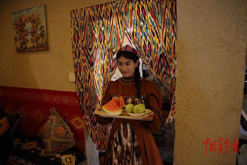 9月12日,新疆和田团城,阿依旺家文化体验馆的服务员为客人端出水果。这家体验馆为游客提供体验团城民俗的服务。中青报·中青网记者 王鑫昕/摄