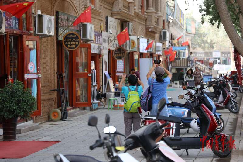 9月12日,新疆维吾尔自治区和田地区(以下简称“新疆和田”)团城,两位游客在拍照。和田团城以前被称为“鸽子巷”,房屋建筑以夯土、砖木结构为主,陈设老旧且存在安全隐患,加之水、电、气等基础配套设施滞后,严重影响了群众生活和城市形象。2016年开始,和田地区深入实施城中村改造工作,整合援疆和项目资金,对团城进行分批改造。改造后的团城街区面貌焕然一新,民俗风情更加浓郁,并于2020年成功创建为国家AAAA级景区。2025年上半年,和田团城累计接待游客125万人次,旅游总花费6875万元。中青报·中青网记者 王鑫昕/摄
