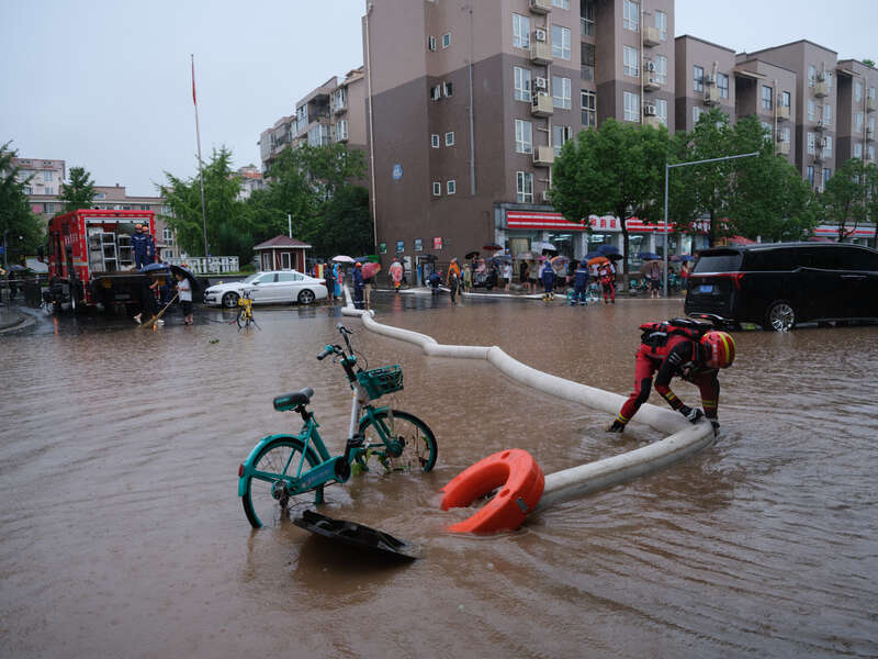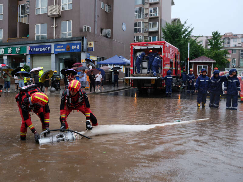 9月16日,四川省成都市天府新区,消防员在积水区域用应急排涝车、大功率水泵协同排水。 当日,成都市遭遇暴雨,导致市区部分区域出现内涝。四川省森林消防总队特勤大队紧急出动25名消防救援人员,携带大功率排涝泵、应急排涝车和排涝机器人等600余件套装备,赶赴成都市天府新区开展排涝救援工作。 当日,成都市气象台发布暴雨黄色预警信号,成都中心城区有雷雨,部分地方大雨到暴雨,提醒广大市民朋友注意防范,提前规划出行路线,避开低洼易涝路段;若发现道路积水、井盖缺失等险情,及时向相关部门反馈,共同筑牢雨天安全防线。 程雪力/摄