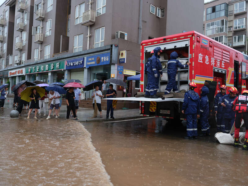 9月16日,四川省成都市天府新区,消防员在积水区域用应急排涝车、大功率水泵协同排水。程雪力/摄