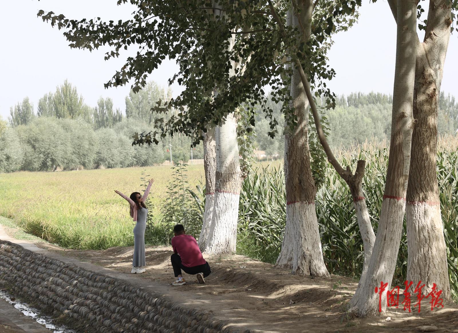 9月13日,新疆和田百和镇稻香村,游客在稻田边的防风林旁拍照留念。中青报·中青网记者 王鑫昕/摄