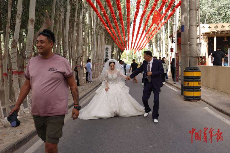 9月13日,新疆和田百和镇稻香村,一对新人专程来拍婚纱照。这对新人表示,稻香村既有和田传统的村庄风貌,也有少见的稻田风光,因此特意来这里拍婚纱照。中青报·中青网记者 王鑫昕/摄