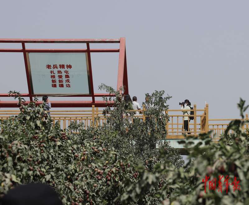 9月13日,新疆生产建设兵团第十四师二二四团红枣标准化精品示范园,参观者在拍照。示范园种植的红枣品种为骏枣,目前正处于丰产期,从观光廊道放眼望去,红玛瑙一般的骏枣挂满枝头,蔚为壮观。作为新疆生产建设兵团在21世纪初投资建设的第一个现代化团场,二二四团传承“老兵精神”,建成13万亩红枣林,万亩蔬菜基地、中草药基地,在荒漠里建起了绿色的家园。中青报·中青网记者 王鑫昕/摄