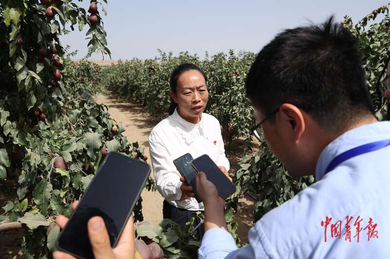 9月13日,新疆生产建设兵团第十四师二二四团红枣标准化精品示范园,该团职工张银银和参观者交流。她开设了社交媒体账号,通过互联网把兵团农产品卖到了更多的地方。目前该团从事电商销售人员超过600人,2024年以来电商销售额已达3.7亿元,带动户均增收超过2万元。中青报·中青网记者 王鑫昕/摄