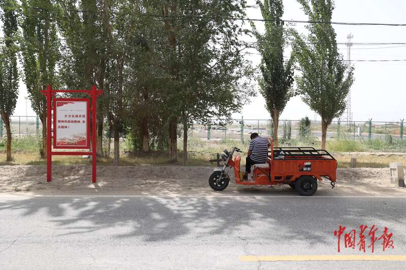 9月13日,新疆生产建设兵团第十四师二二四团红枣标准化精品示范园附近,一位等待运物资的工作人员。中青报·中青网记者 王鑫昕/摄