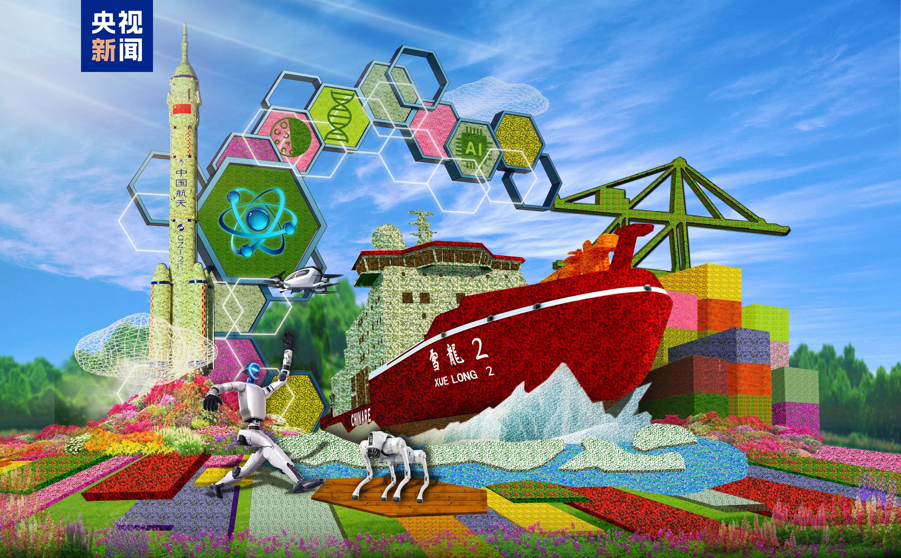 西单东南角——“科技强国”花坛以展示我国在科技领域的创新成果(雪龙2号破冰船、神舟二十号、智能码头、机器人等)为场景,寓意推进高水平科技自立自强,朝着建成科技强国的宏伟目标奋勇前进。花坛顶高8.5米。