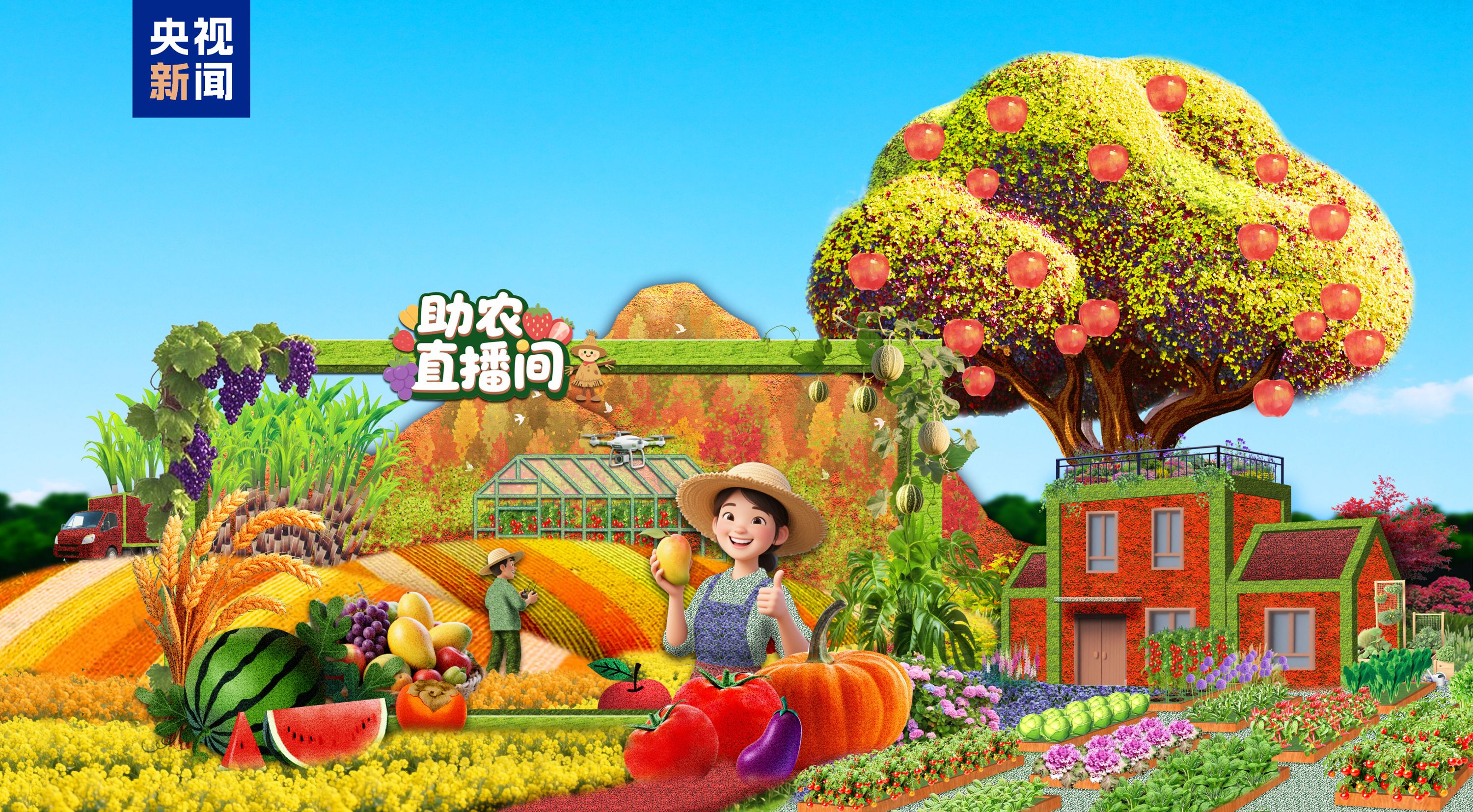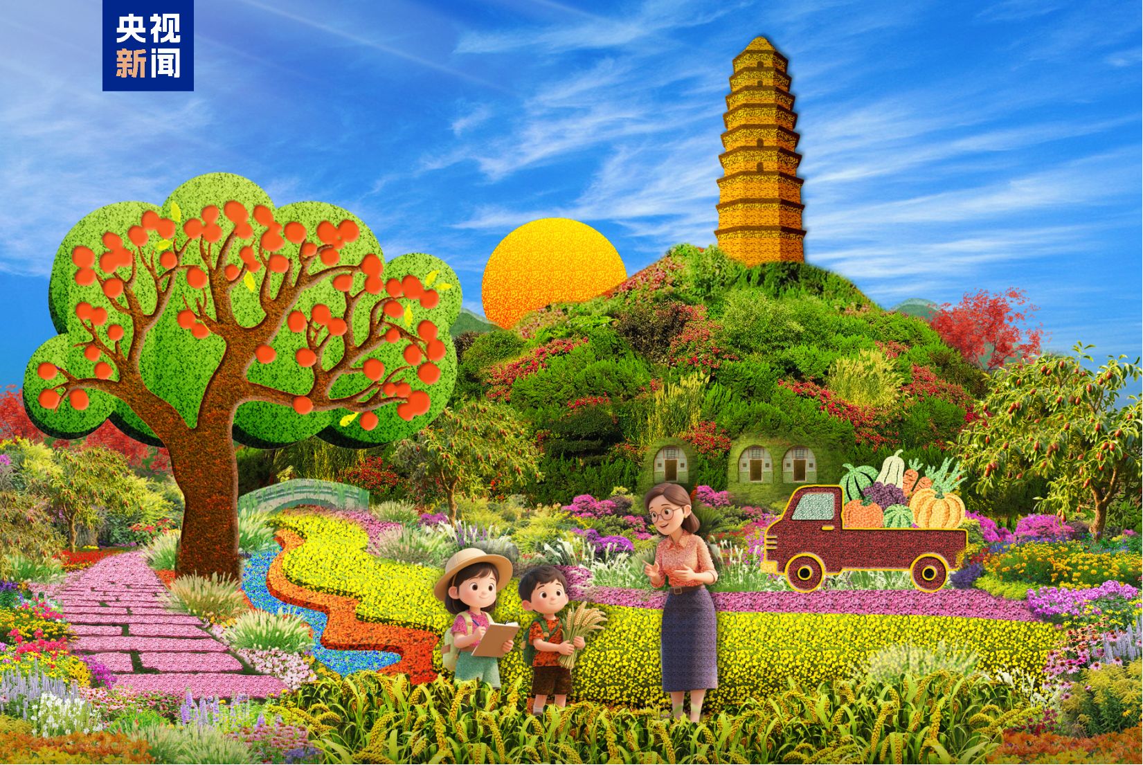 西单西北角——“乡村振兴”花坛以喜庆丰收的花园式新农村幸福生活为场景,谱写生态宜居、和谐稳定、群众安居乐业的中国特色社会主义乡村振兴新篇章。花坛顶高8.5米。