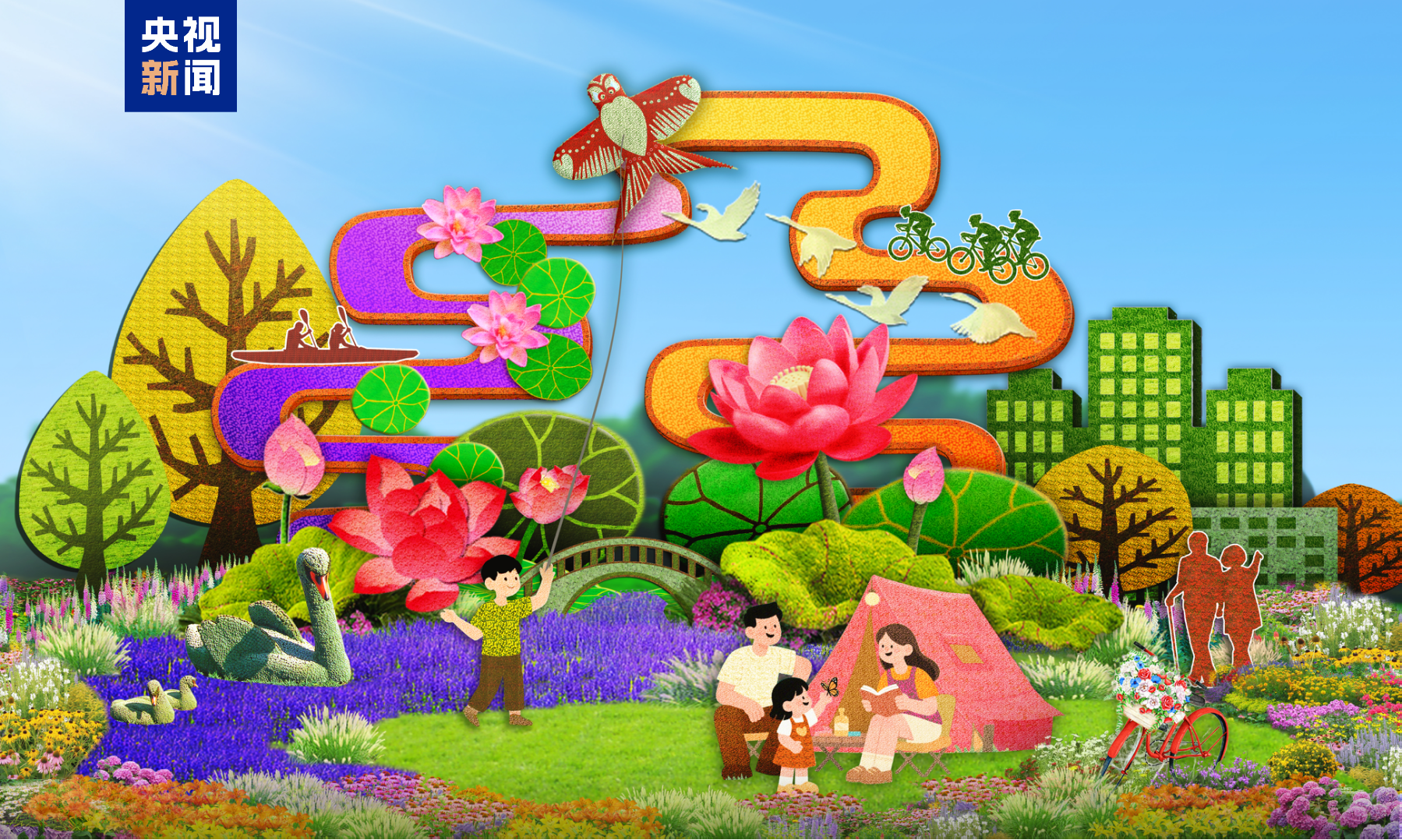 西单西南角——“绿色生活”花坛以蓝绿交织的生态家园为背景,落实“绿化、彩化、立体化”的建设理念,配以休闲、露营、健身等场景,寓意走可持续的绿色发展之路,建设人与自然和谐共生的现代化新图景。花坛顶高8.5米。