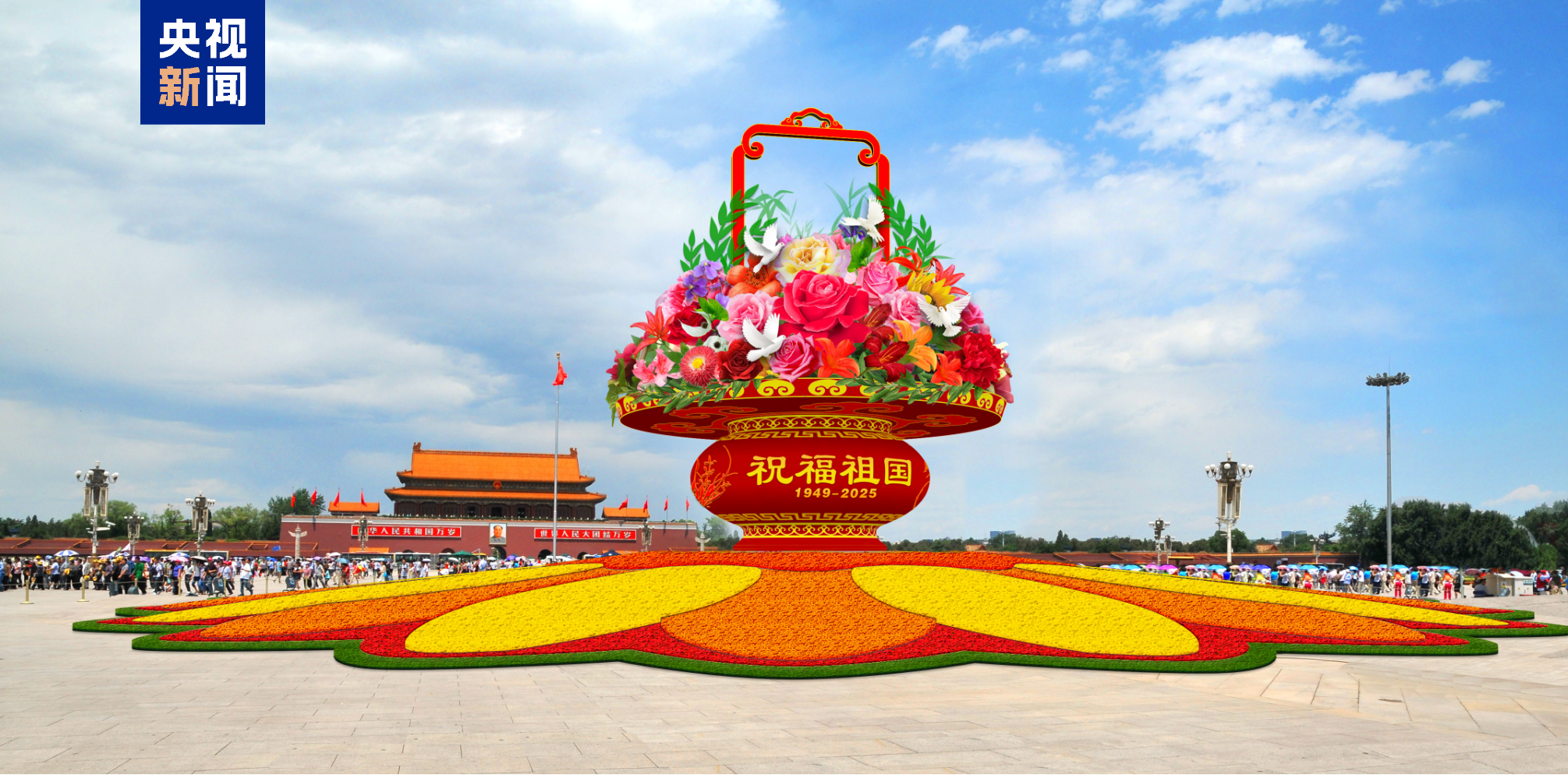 天安门广场中心“祝福祖国”花坛以喜庆的花篮为主景,花坛底部直径45米,为向日葵图案,寓意葵花朵朵向太阳。花坛顶高18米,篮体高16米,篮盘直径12米。在篮体南侧书写“祝福祖国,1949—2025”字样,在篮体北侧书写“欢度国庆,1949—2025”字样。篮内选取了美好寓意的花卉,其中荷花寓意和和美美、月季寓意和平希望、珙桐寓意和平之树、橄榄枝寓意荣耀和平、向日葵寓意自由幸福、山丹丹寓意团结奋进、英雄花寓意英勇无畏,结合和平鸽元素,体现“和平发展、欣欣向荣”,表达对祖国繁荣富强的美好祝福,对世界和平发展美好期盼。