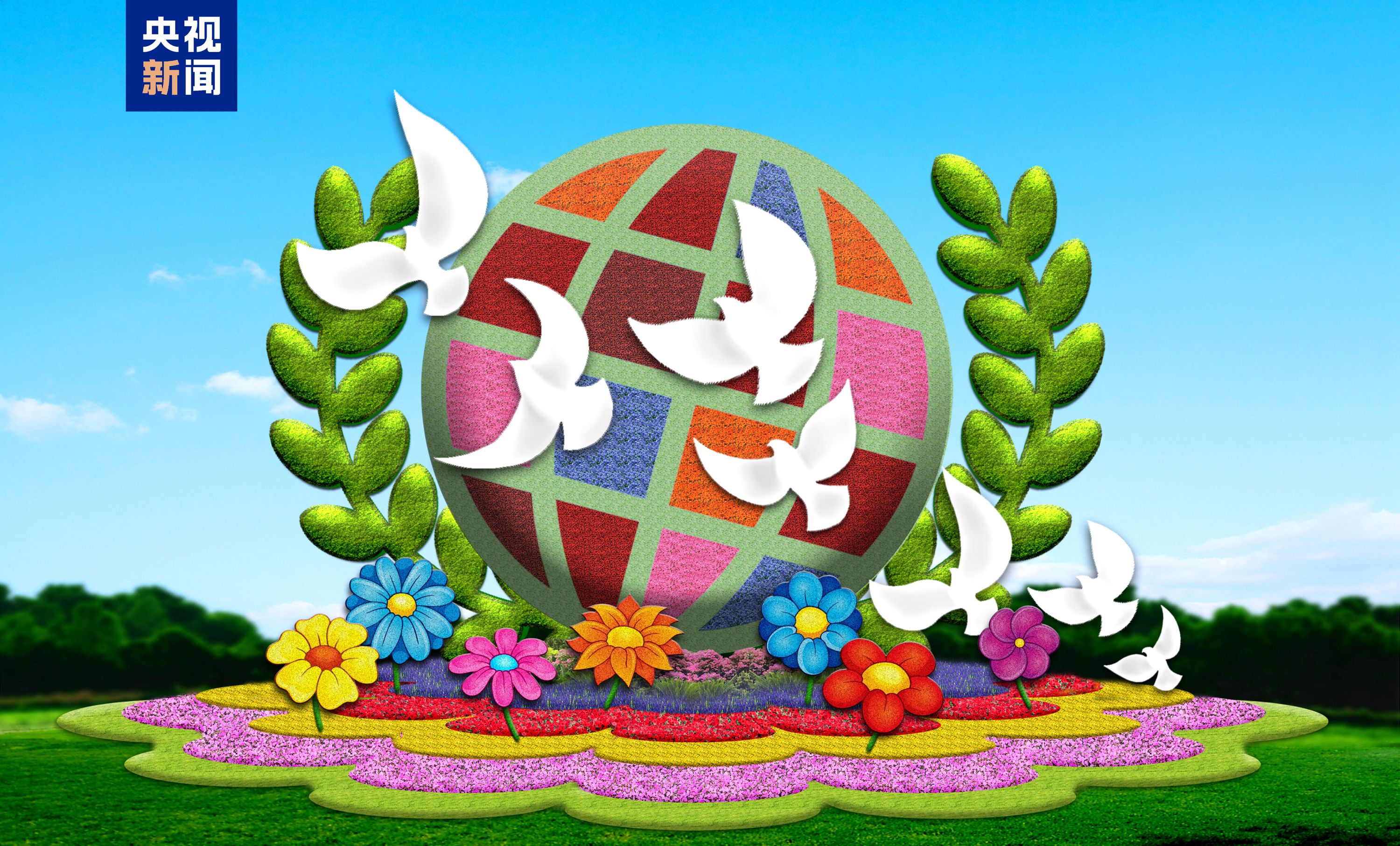 建国门西北角——“和平发展”花坛以地球、橄榄枝、和平鸽为主景,寓意高举和平、发展、合作、共赢的旗帜,促进世界和平与发展,推动构建人类命运共同体。花坛顶高8.0米。
