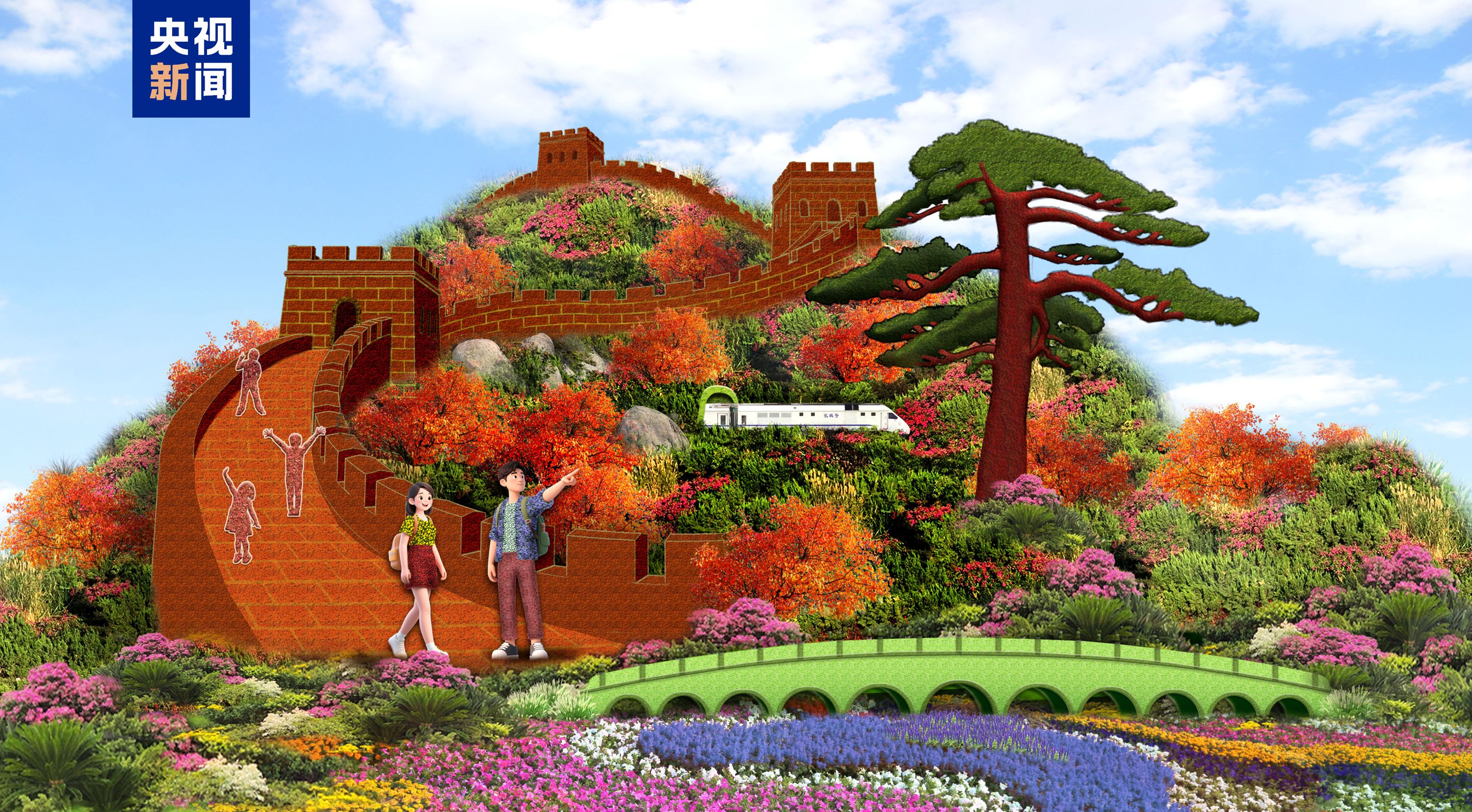 东单西南角——“锦绣山河”花坛以巍峨的万里长城为主景,配以穿梭山间的小火车、漫山遍野的红叶、卢沟桥及观赏美景的游客等,体现祖国的锦绣河山,书写新时代绿水青山的壮美篇章。花坛顶高8.5米。