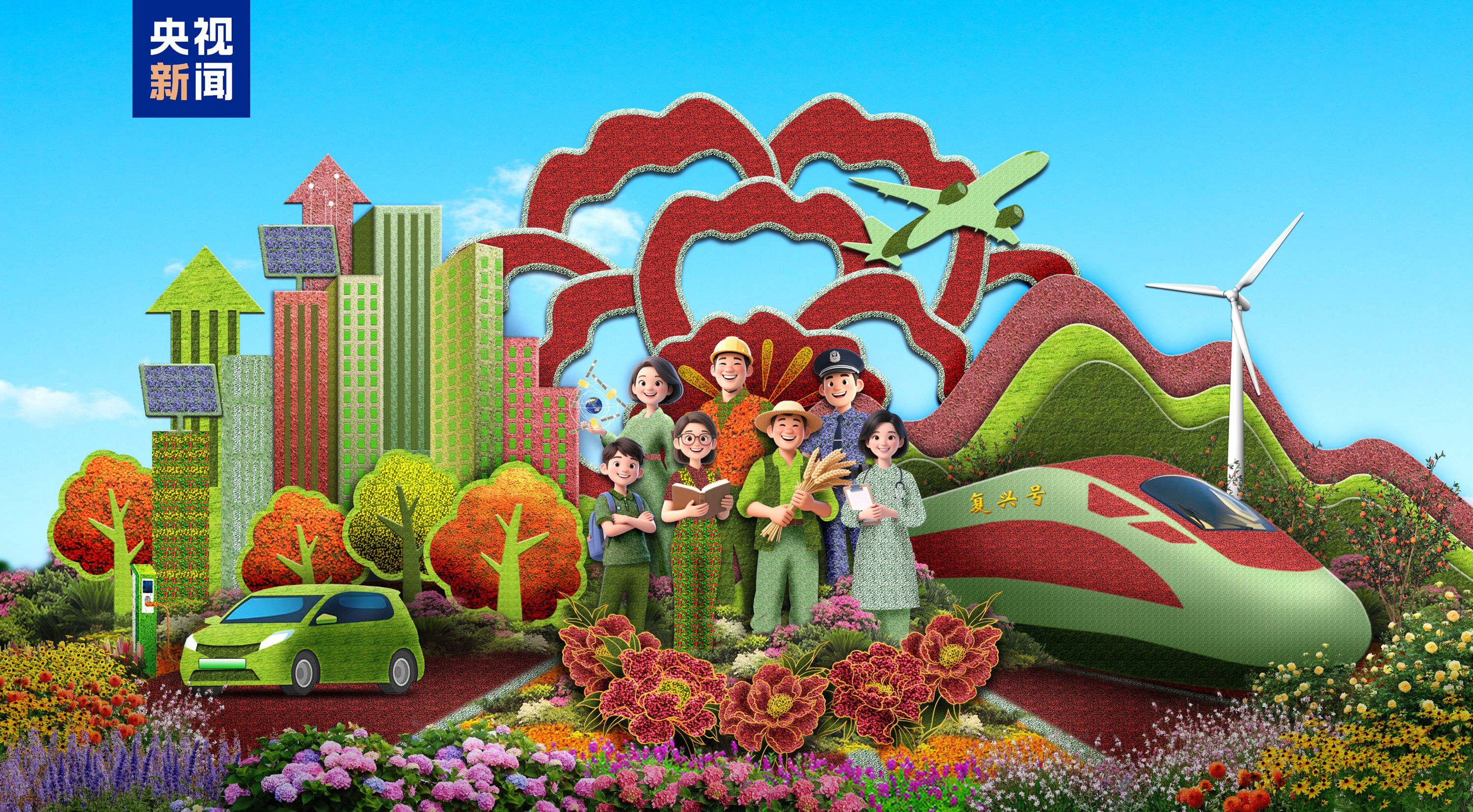 西单东北角——“繁荣发展”花坛以人民为中心(科技工作者、工人、农民、警察、医师、教师、学生),展示了花开盛世、生机盎然的繁荣发展景象,寓意共建共治共享,以新发展理念为引领推动高质量发展。花坛顶高8.5米。