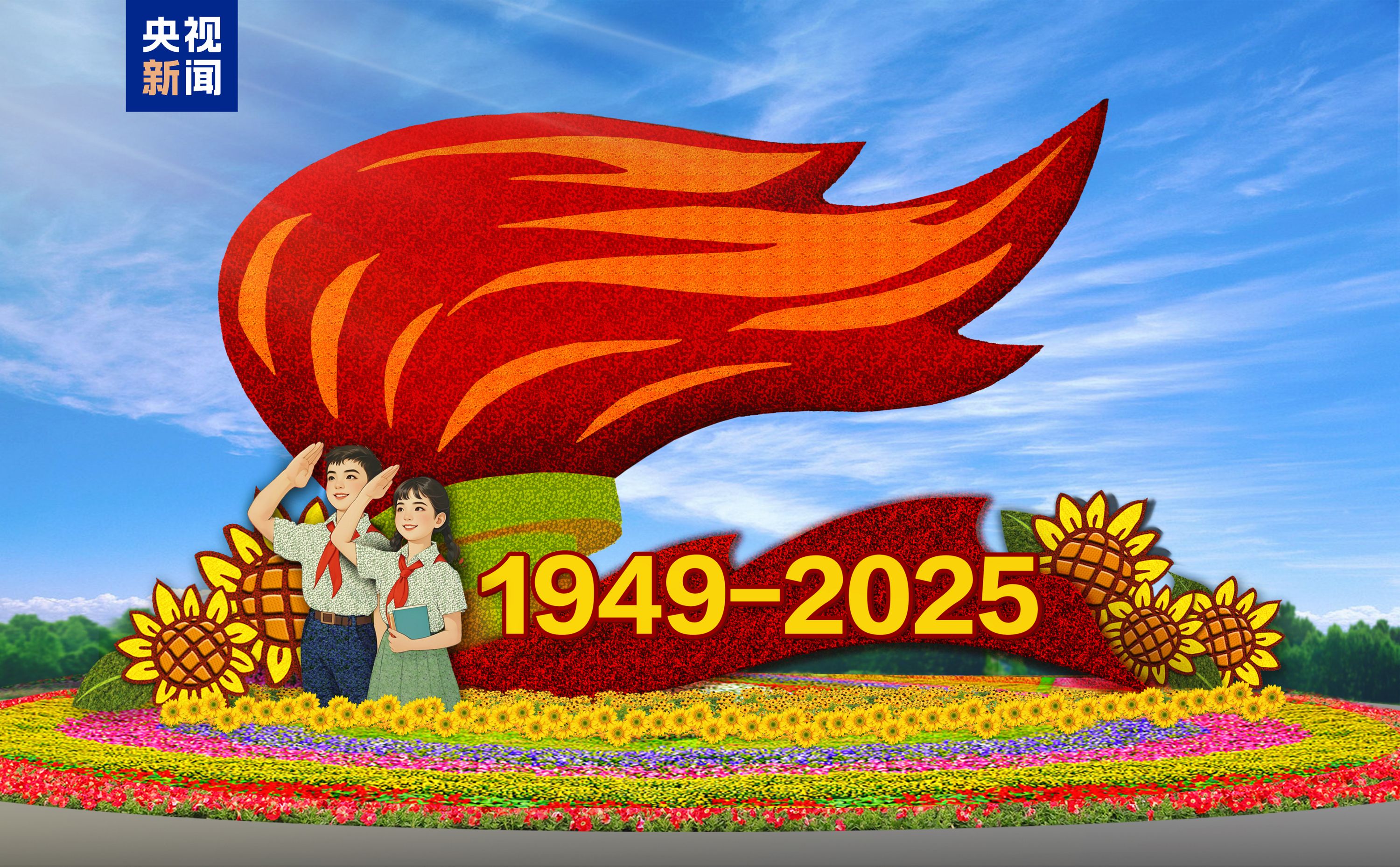 东单西北角——“继往开来”花坛以火炬为主景,配以“1949—2025”年号、少先队员、红飘带、向日葵等,寓意继往开来,接续奋斗,勇做新时代的追梦人。花坛顶高8.5米。