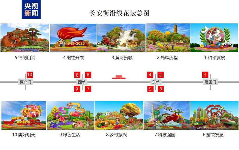今年,长安街沿线建国门到复兴门之间精心布置10组立体花坛,描绘了祖国繁荣昌盛、人民安居乐业的中国式现代化新篇章。10组立体花坛从中国人民抗日战争暨世界反法西斯战争胜利80周年纪念活动布置后延续国庆,进行元素更换和植物调整,保证呈现最佳的景观效果。