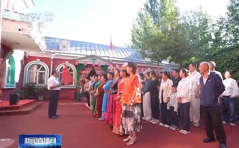 新疆塔城市新城街道哈尔墩社区居民 阿依霞·斯马克:升国旗,每一个民族自己的衣服穿好,就是尊重。