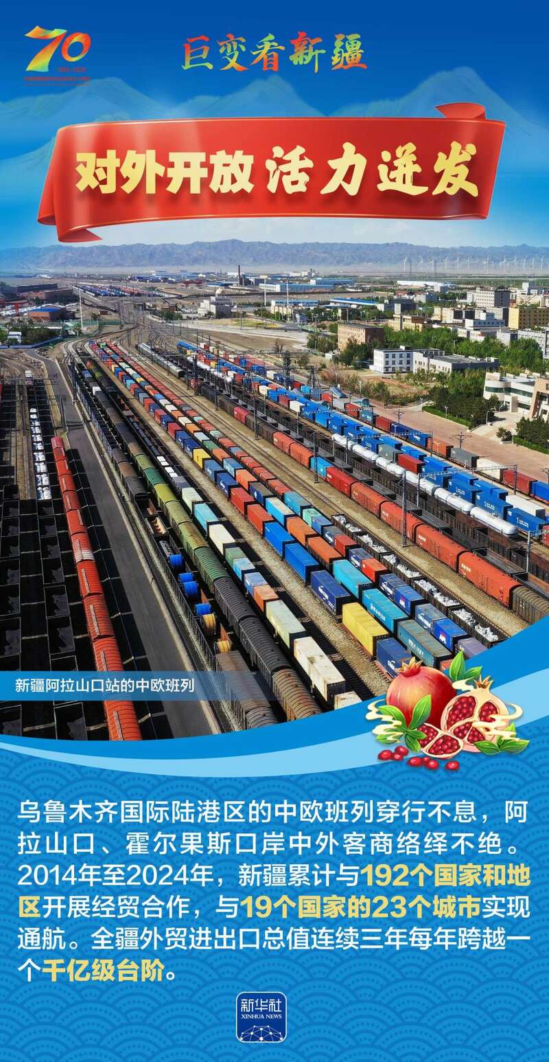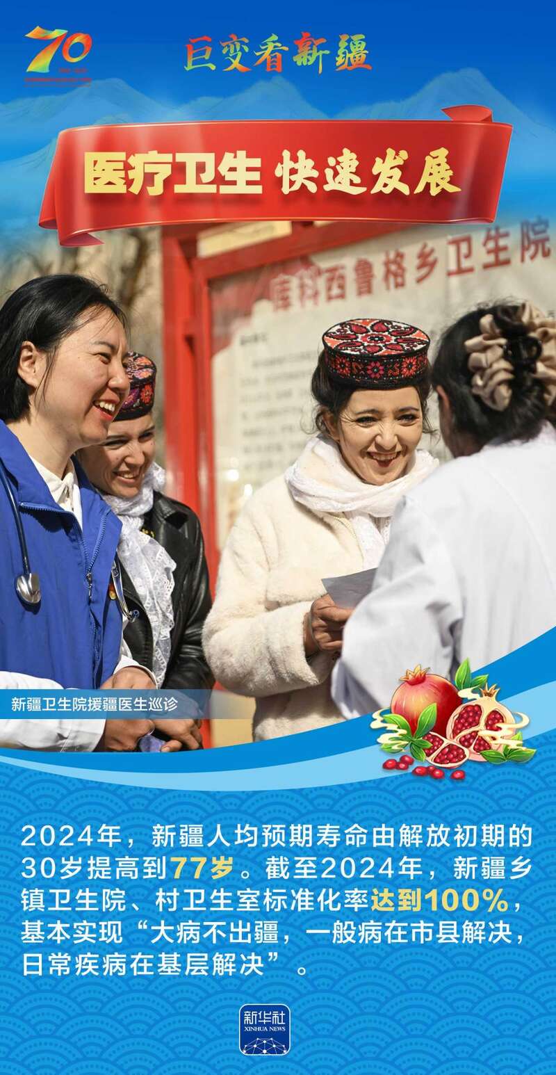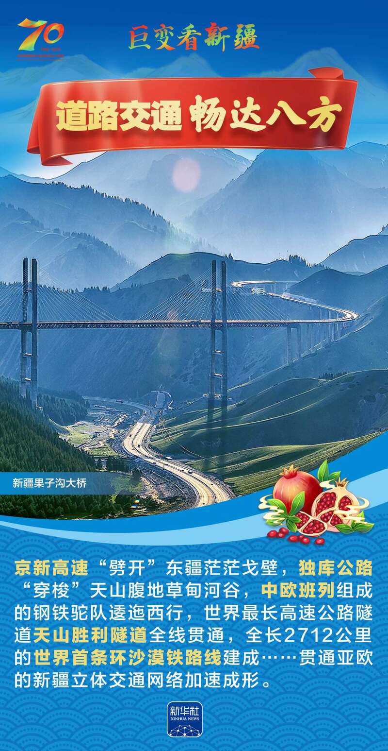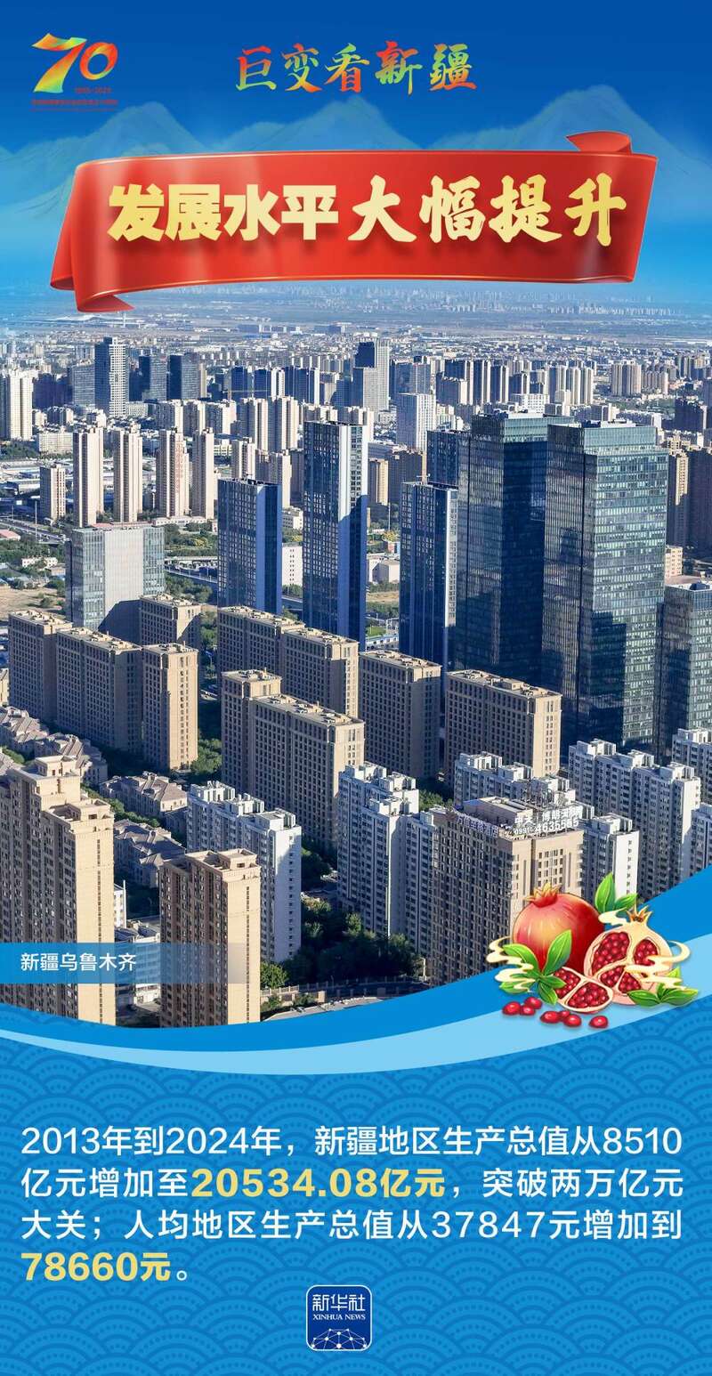 1955年10月1日,新疆维吾尔自治区成立,开启了新疆民族区域自治的光辉历程。70年来,新疆各族人民生活水平大幅提高,社会事业全面进步,生态环境显著改善……让我们跟随这组海报,一起见证在党中央坚强领导下,新疆各族群众团结奋进、砥砺前行的光辉历程,感受天山南北高质量发展的壮阔画卷。