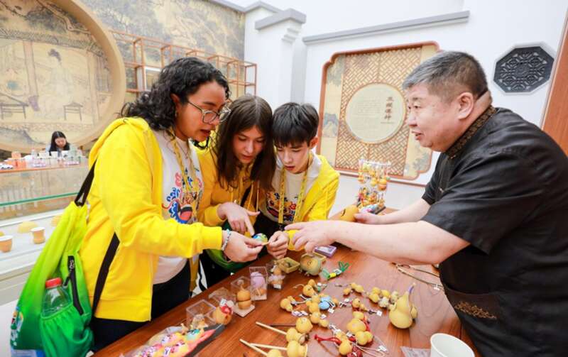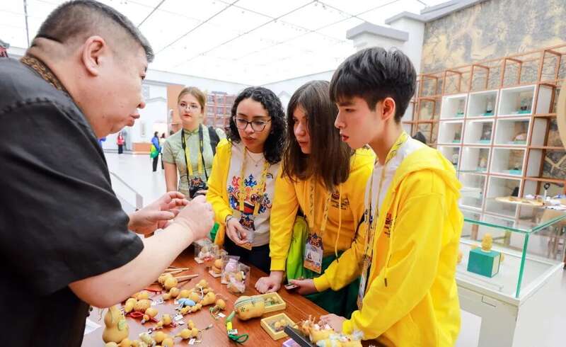 赛场之外,正逢“东方雅韵 遇见精彩”天津文化遗产展对外开放。泥人张、杨柳青年画等津味十足的文化展台吸引了不少选手驻足体验。在“葫芦庐”展位前,来自埃及的王美林拿着一个卡皮巴拉葫芦挂件爱不释手:“这个太可爱了,又萌又有创意!我打算把它挂在我的包包上。”