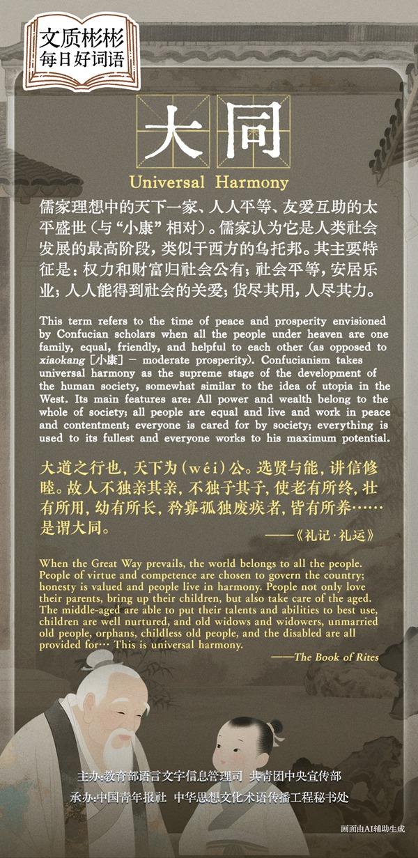This term refers to the time of peace and prosperity envisioned by Confucian scholars when all the people under heaven are one family, equal, friendly, and helpful to each other (as opposed to xiaokang - moderate prosperity). Confucianism takes universal harmony as the supreme stage of the development of the human society. Its main features are: All power and wealth belong to the whole of society; all people are equal and live and work in peace and contentment; everyone is cared for by society; everything is used to its fullest and everyone works to his maximum potential.