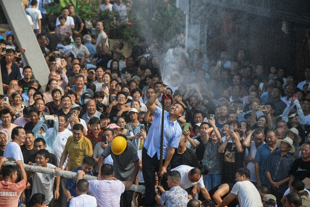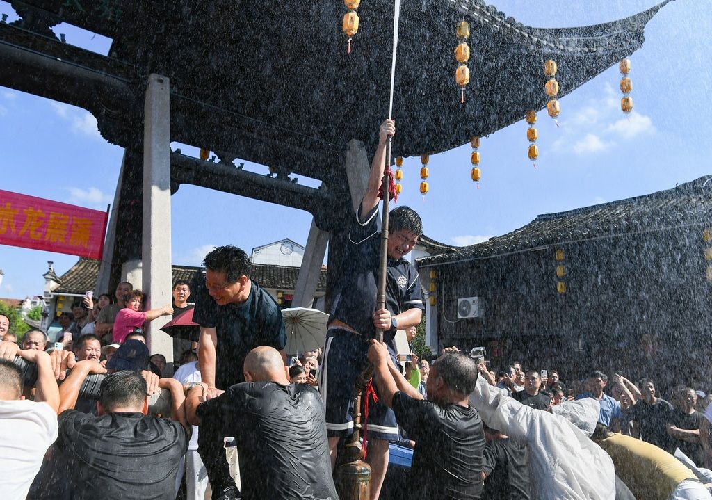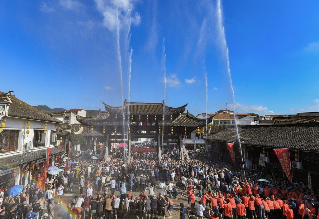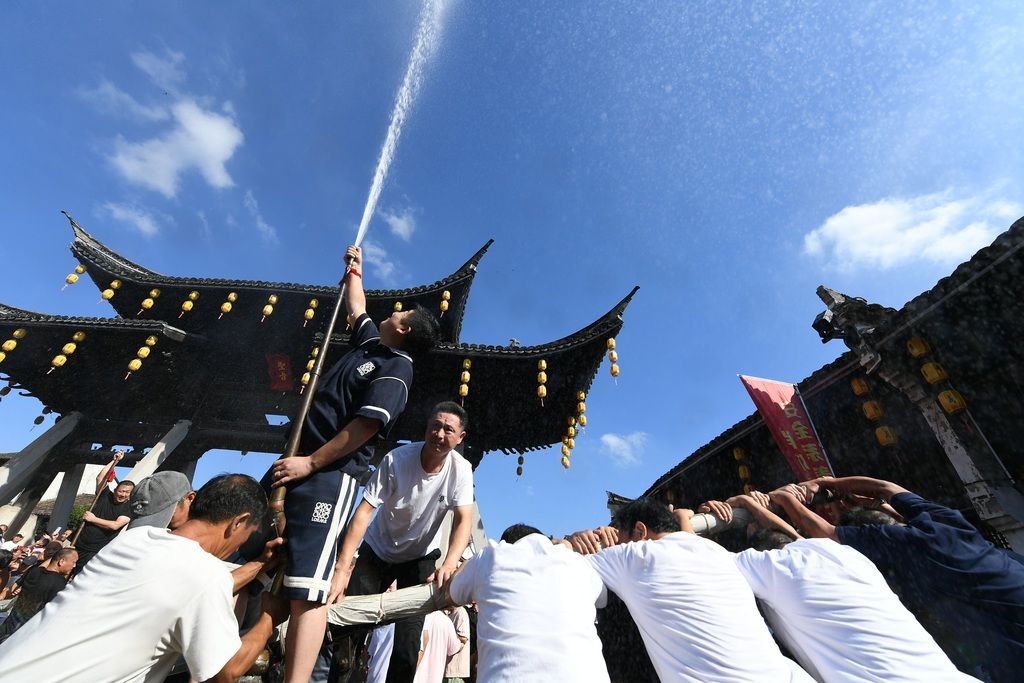 2025年9月22日,浙江省金华市浦江县郑宅镇举行“试水龙”活动,水龙手站在大水桶上,掌龙头、压水苗。