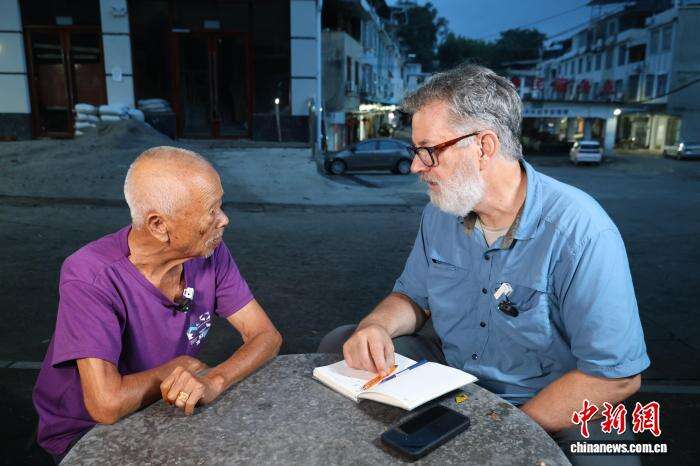 9月9日,卢百可(右)在广西柳州寻访飞虎队坠机地见证者。 林馨 摄