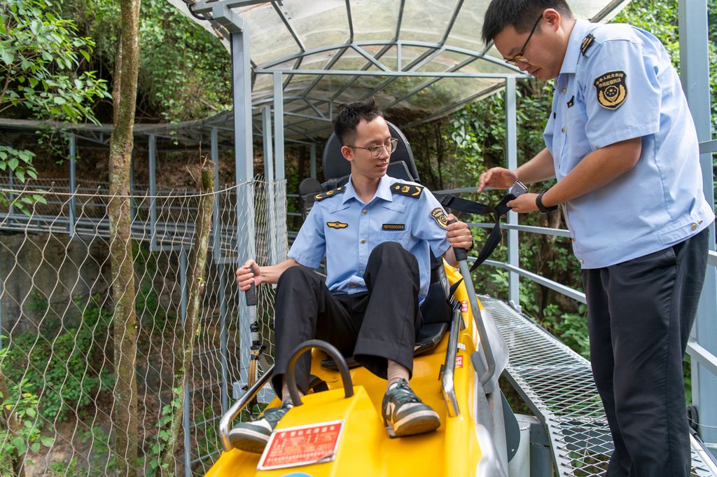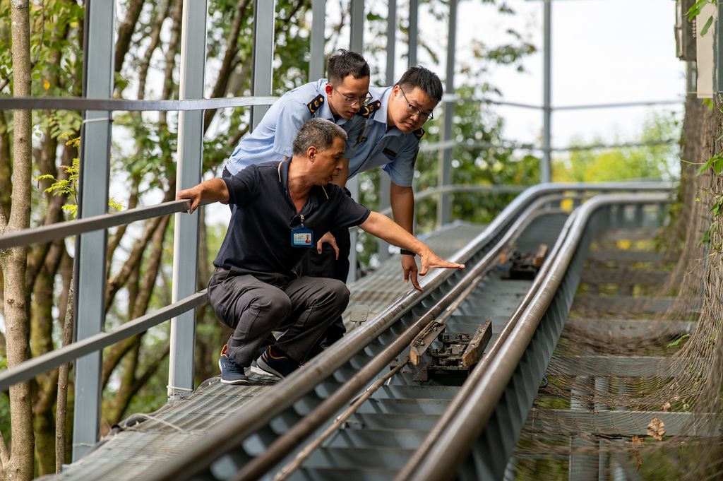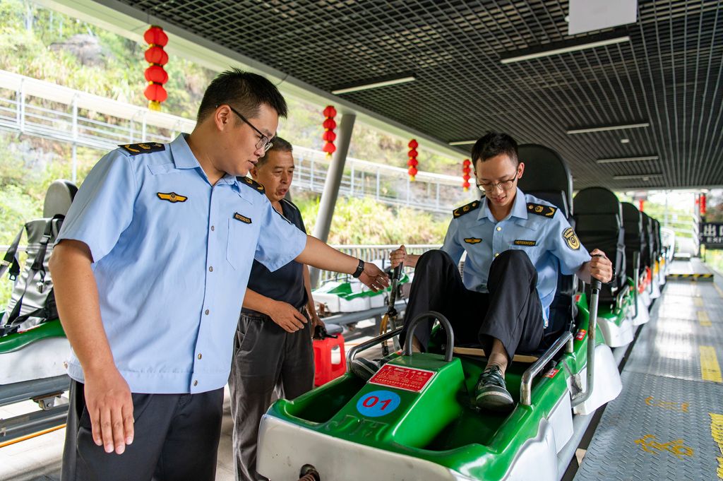 2025年9月23日,浙江省金华市,兰溪六洞山景区里,当地市场监管局工作人员正在开展滑道设备节前安全检查。