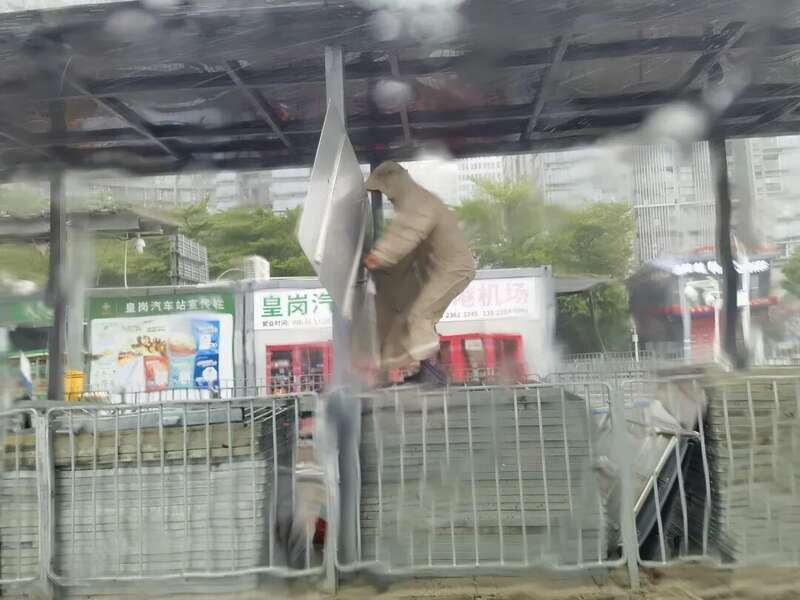 皇岗口岸的士站,有指示牌被风刮下,福田交通局工作人员正紧急清理。