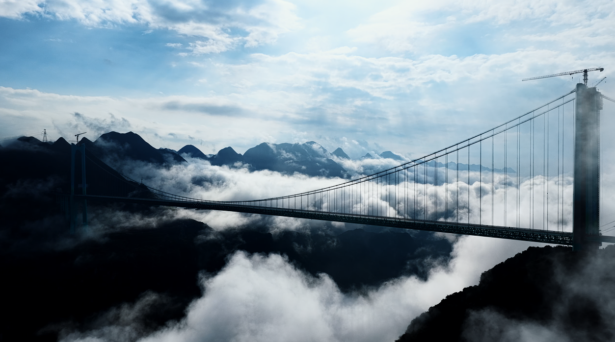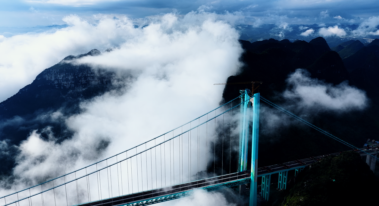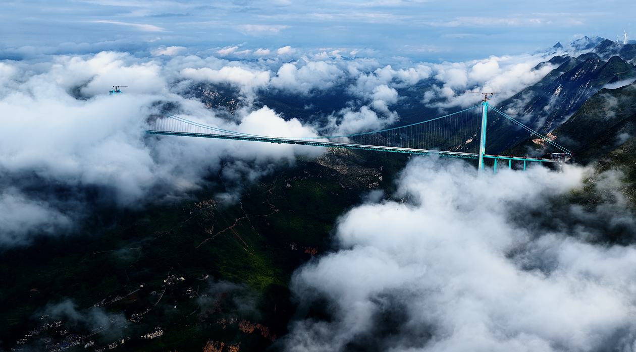 贵州的山,铸就了坚韧风骨;贵州的桥,延伸着腾飞梦想。面对92.5%的山地和丘陵,贵州发扬“逢山开路、遇水架桥”的拼搏精神,攻克了峡谷强风、复杂地质等世界级难题。花江峡谷大桥巍然屹立于被誉为“地球裂缝”的花江大峡谷之上,大桥全长2890米,主跨径达1420米,是目前世界山区峡谷第一大跨度钢桁梁悬索桥;其桥面距水面垂直高度625米,超越北盘江第一桥成为新的“世界第一高桥”,被誉为“横竖都是第一”。大桥的建成,不仅是物理高度上的巅峰,更是贵州推动经济社会高质量发展的有力印证。