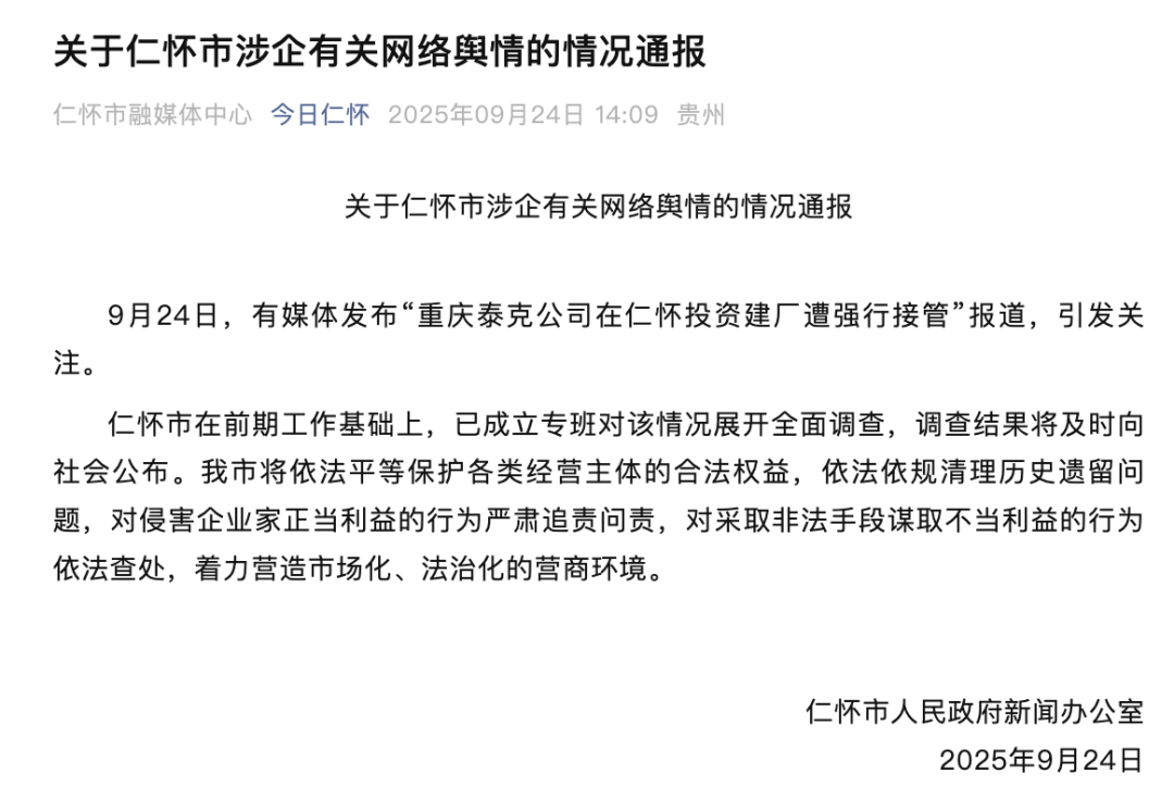 据“今日仁怀”公众号,9月24日,针对媒体发布的“重庆泰克公司在仁怀投资建厂遭强行接管”报道,仁怀市政府新闻办公室发布情况通报。
