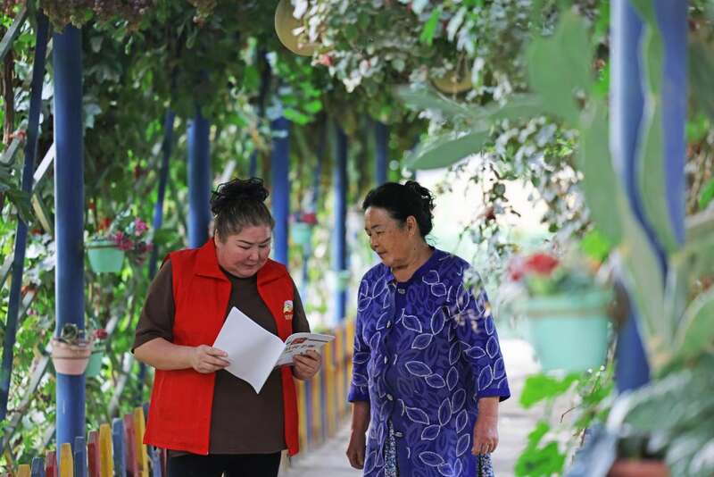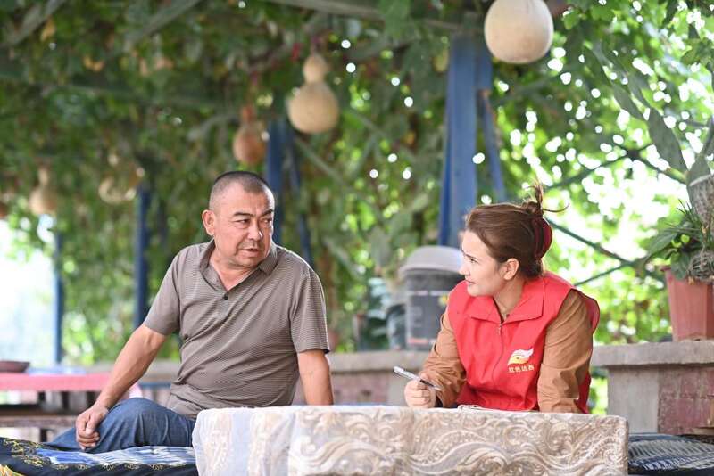 9月18日,达西村村干部古力帕尔力·克衣木(右)入户询问村民生活情况。
