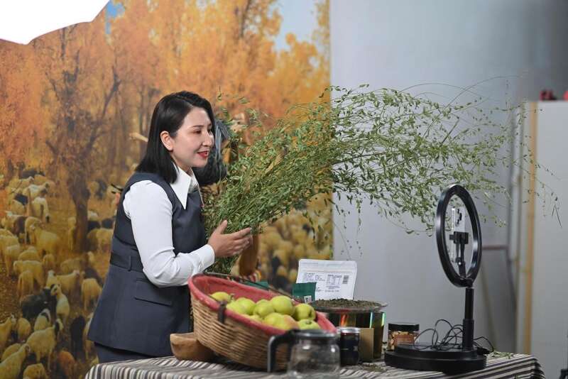 9月19日,尉犁县电商协会负责人米日阿依·阿西木在达西村的电商基地直播推介达西村农产品。近年来,达西村构建“农户生产+企业加工包装+电商销售+物流配送”全产业链,为县域经济发展培养孵化本土直播电商人才,促进传统产业转型升级。