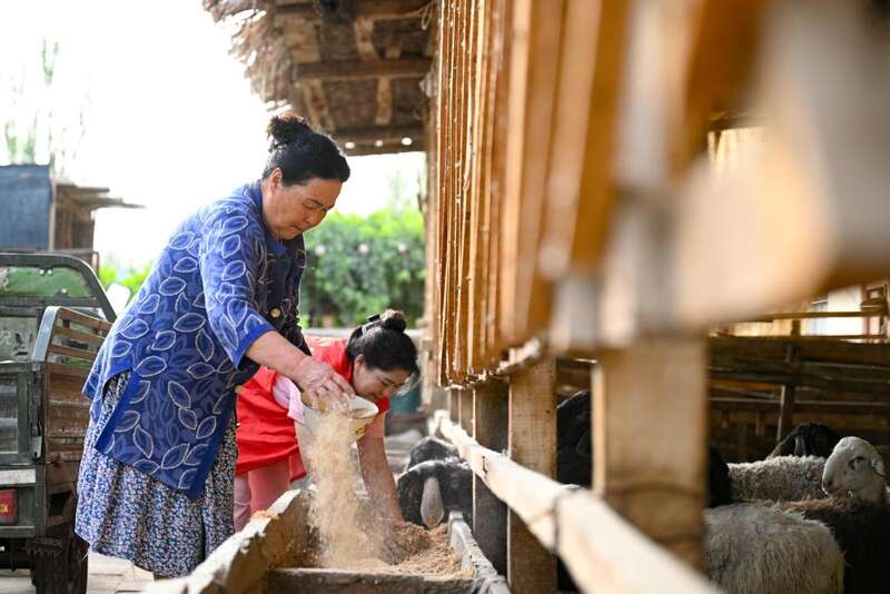 9月18日,达西村村干部卡麦尔汗·苏来曼(后)入户帮助村民喂羊。