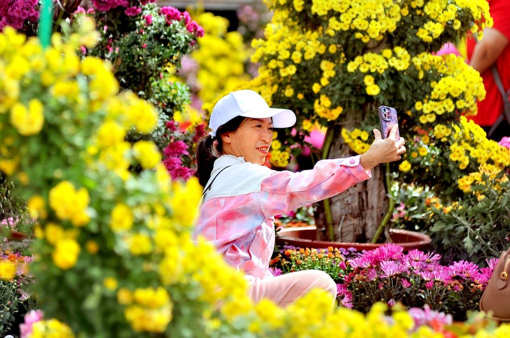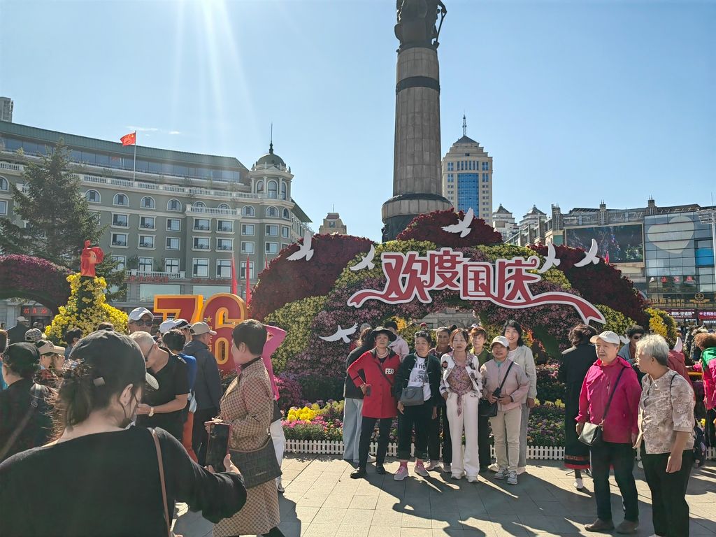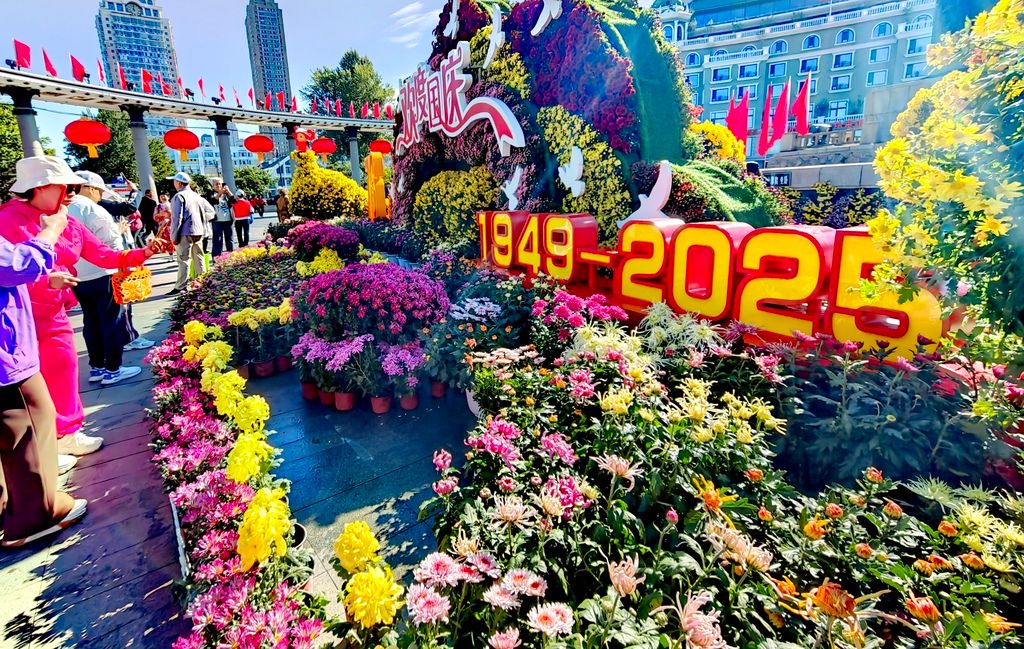 2025年9月25日,哈尔滨市道里区松花江畔防洪纪念塔旁,为迎接国庆节而布置的花坛吸引了许多游客市民前来观赏,现场摆放了数十个品种2万多株菊花。
