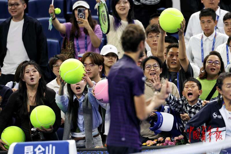 9月29日,北京国家网球中心,2025中国网球公开赛男子单打1/4决赛结束后,球迷向梅德韦杰夫热情地打招呼。中青报·中青网记者 曲俊燕/摄