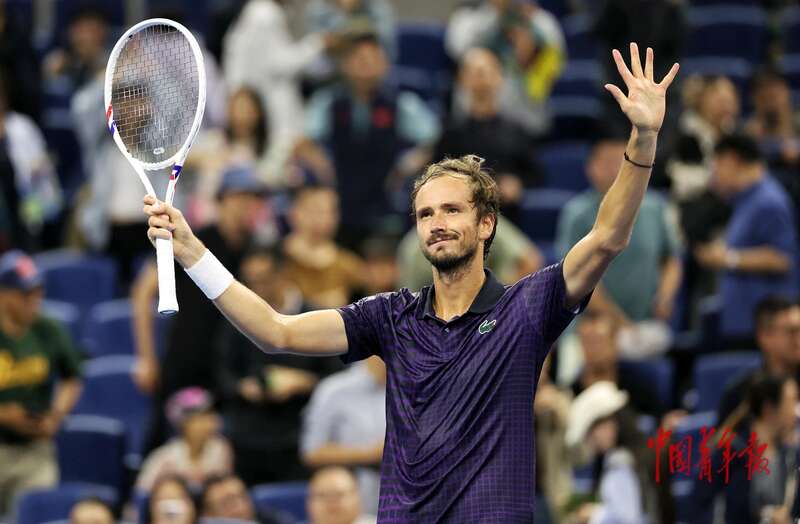 9月29日,北京国家网球中心,2025中国网球公开赛男子单打1/4决赛,梅德韦杰夫得分后示意聆听观众欢呼。中青报·中青网记者 曲俊燕/摄