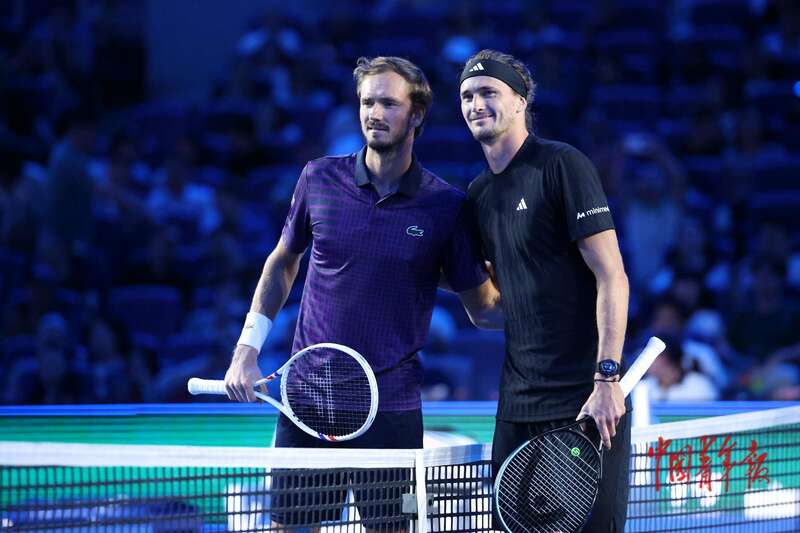 9月29日,北京国家网球中心,2025中国网球公开赛男子单打1/4决赛开始前,梅德韦杰夫(左)与兹维列夫合影。中青报·中青网记者 曲俊燕/摄