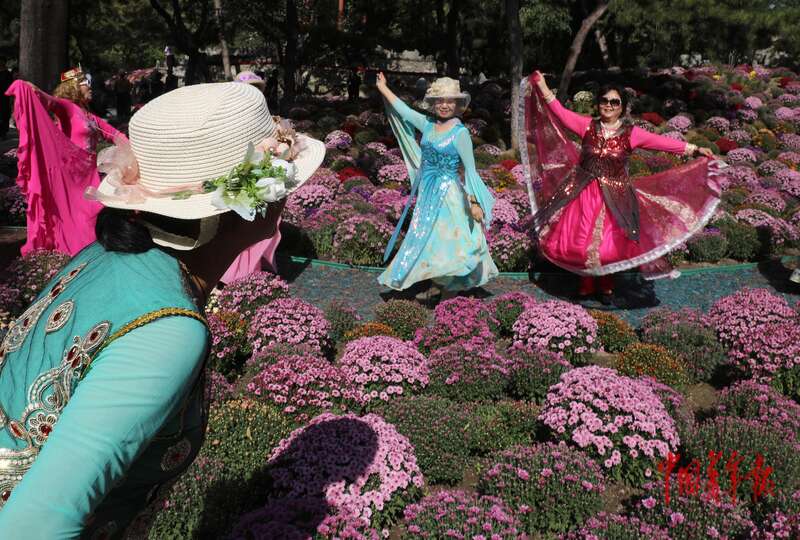 9月30日,北京日坛公园,市民穿着舞蹈演出服装在花丛中拍照。中青报·中青网记者 陈剑/摄