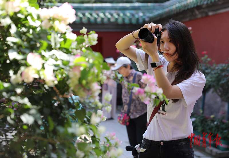 9月30日,北京日坛公园,一位女青年正在拍摄一处花墙。中青报·中青网记者 陈剑/摄