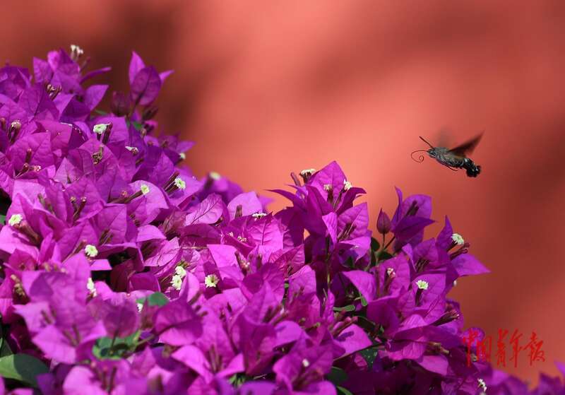 9月30日,北京日坛公园,蜂鸟鹰蛾穿梭在花丛中采花蜜。中青报·中青网记者 陈剑/摄