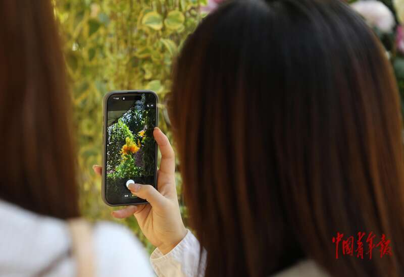 9月30日,北京日坛公园,年轻人用手机拍摄一处花卉。中青报·中青网记者 陈剑/摄