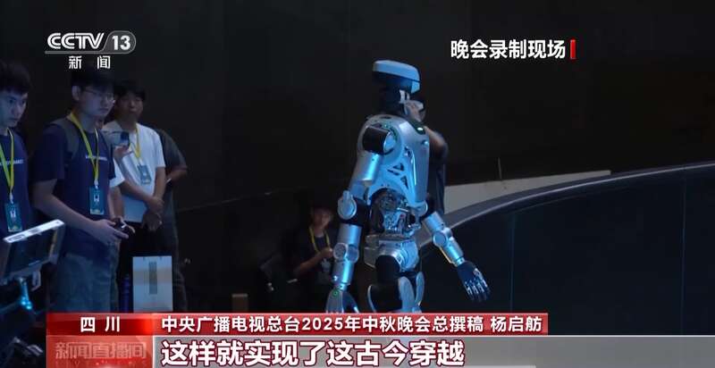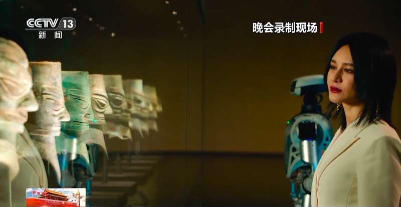 中央广播电视总台2025年中秋晚会总撰稿 杨启舫:我们会在一个节目里用古老的青铜大面具、大立人来和代表着未来科技的机器人对话,这样就实现了古今穿越和跨越的这么一种表现方式。