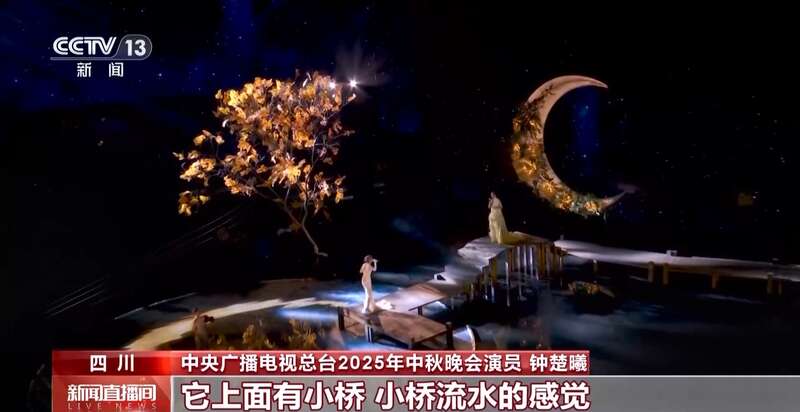 中央广播电视总台2025年中秋晚会演员 钟楚曦:舞台不只打动我,还惊艳我。因为我刚到现场的时候,它上面有小桥,小桥流水的感觉,还有一轮非常大的弯月在高空中悬挂着,皓月上面有很多的鲜花簇拥。