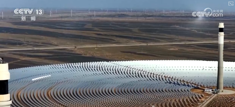 园区中,23000多面定日镜如同一个个精准的“追光者”,通过智能控制系统实时追踪太阳轨迹,将分散的太阳光集中反射到高达200多米的吸热器上,再通过大容量熔盐储热系统,实现24小时连续稳定供电。